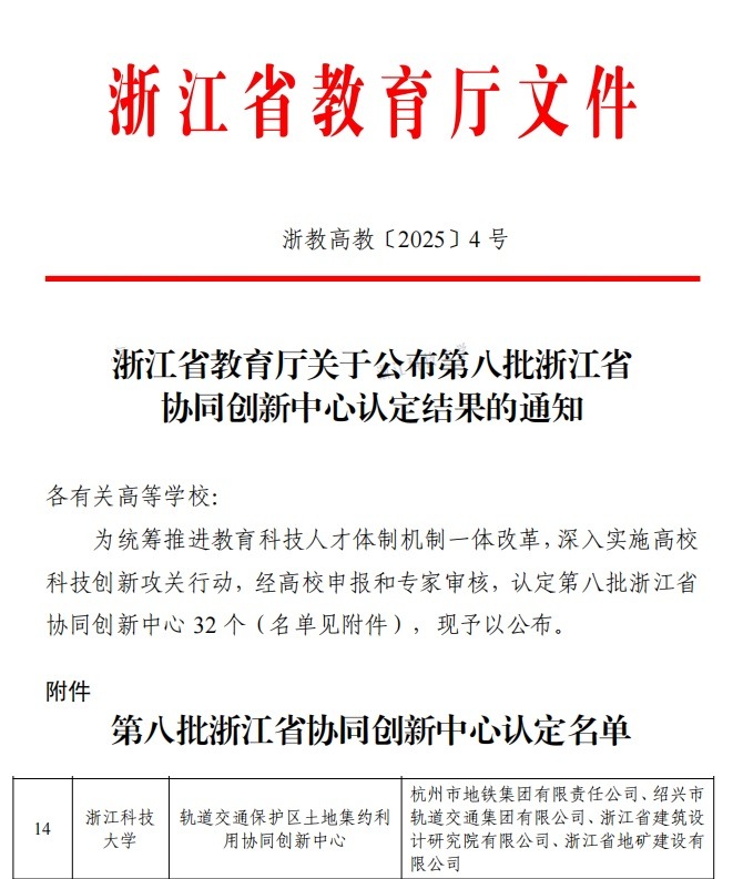 近日,浙江省教育厅公布了第八批浙江省协同创新中心认定名单,我校建工学院牵头建设的“轨道交通保护区土地集约利用协同创新中心”被认定为省级协同创新中心。截至目前,学校共建有省级协同创新中心2个。