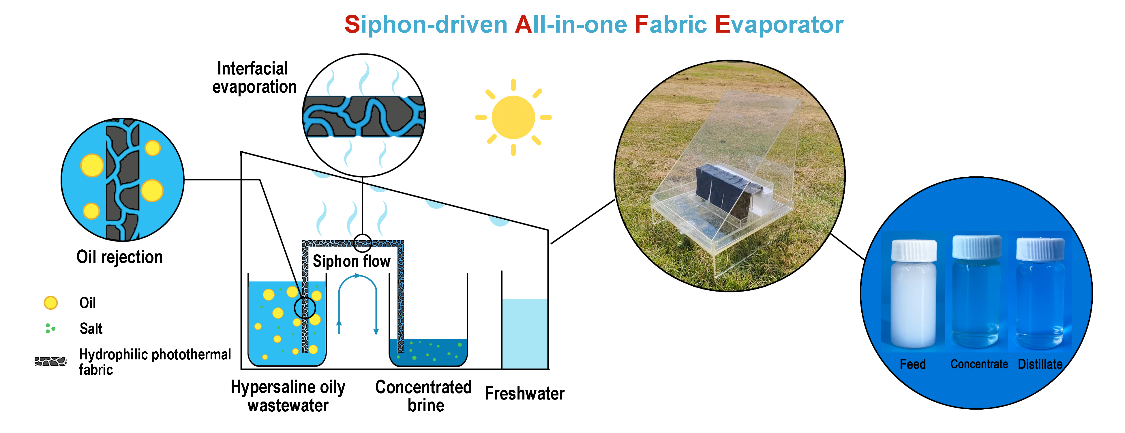 团队在胶体与界面科学领域高水平期刊Journal of Colloid and Interface Science上在线发表了题为“Siphon-driven all-in-one fabric evaporators for multi-purpose treatment of hypersaline oily wastewater”的论文(点击阅读),2023级硕士研究生李响为该论文第一作者,黄俊教授、邓然博士与浙江大学杨皓程研究员为论文通讯作者。久久精品一区二区|久久久一区二区三区|欧美日韩视频|欧美福利视频|高清欧美性猛交xxxx黑人猛交|久久久www成人免费精品|在线观看成人网站为第一单位。工业高盐含油废水因其成分复杂、处理难度大,一直是环境治理领域的一大难题。传统处理技术,如反渗透、膜蒸馏等,常面临膜污染以及盐分回收困难等瓶颈。生物催化与分子诊断研究团队创新性地开发出一种耦合单向虹吸流动与太阳能驱动蒸发的一体化纤维蒸发器(SAFE),巧妙集成截留、蒸发与浓缩过程,实现了高盐含油废水中油、水与盐的高效分离与资源化回收,为工业废水处理提供了极具潜力的创新解决方案。本研究通过贻贝仿生沉积技术,制备出兼具优异亲水疏油特性和高效光热转换能力的亲水光热纤维膜。纤维膜利用其优异的亲水性实现对油滴的有效截留,并通过虹吸效应实现盐溶液在纤维内的自发、定向传输。在太阳光驱动下,水分快速蒸发并经冷凝后回收得到清洁淡水。与此同时,浓缩后的盐水在纤维出口端被及时导出,此设计有效抑制了盐分结晶对蒸发过程的阻碍问题,进而实现了高效、持续的蒸发性能。实验结果表明,SAFE系统展现出卓越的蒸发效率和油水分离能力。在一个太阳光照下,SAFE蒸发速率可达2.19 kg·m-2h-1,盐分浓缩1.57倍,油水分离效率突破99.8%,户外实验也进一步证实了其优异的抗污性和长期稳定性。