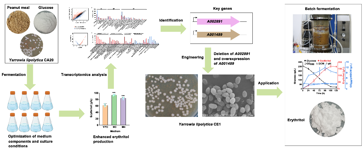 团队在生物资源领域权威期刊Bioresource Technology在线发表题为“Metabolic engineering combined with fermentation optimization enables sustainable production of erythritol by Yarrowia lipolytica from peanut meal and glucose”(点击阅读)的论文。2022级硕士研究生陈雨晴为论文第一作者,黄俊教授和夏凯博士为论文通讯作者,久久精品一区二区|久久久一区二区三区|欧美日韩视频|欧美福利视频|高清欧美性猛交xxxx黑人猛交|久久久www成人免费精品|在线观看成人网站为第一单位。近年来,天然甜味剂赤藓糖醇凭借肠道耐受性好、低热值和不改变血糖浓度等特性而受到食品及医药行业的广泛关注,市场需求量快速上升。目前,赤藓糖醇主要由解脂亚罗酵母(Yarrowia lipolytica)以葡萄糖为底物进行高渗发酵制备,生产成本较高。为降低生产成本,研究团队成功创制了利用花生粕和葡萄糖发酵合成赤藓糖醇的方法。通过发酵条件优化和代谢工程改造,实现废弃物花生粕的高价值利用。此外,研究揭示了解脂亚罗酵母适应花生粕培养基的分子机制,成功挖掘关键基因A001489和A002891。研究结果为定向选育高产菌株和提高赤藓糖醇发酵水平提供了新思路。