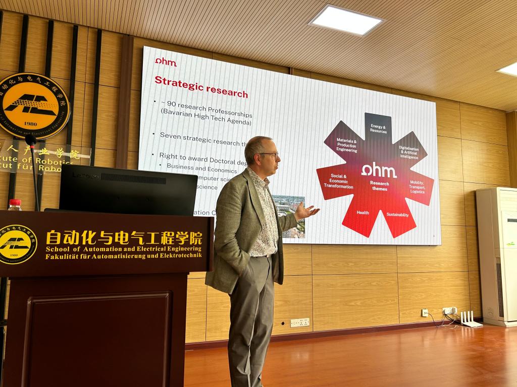 近日,电气学院第40期“和山控制论坛”举办。德国纽伦堡应用科学大学Christian Siegel教授与Frank Pohlau教授担任主讲嘉宾,围绕“数字孪生技术软件架构”及“教学与研究的互促模式”展开深度分享,吸引了近百名师生参与。